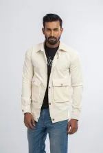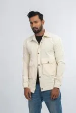 Designed with utility-inspired details, it features two spacious flap pockets, button-down front closure, and a sharp collared neckline that adds structure to your outfit. The off-white tone gives it a clean, versatile appeal — ideal for pairing with jeans, chinos, or even layered over a graphic tee for a modern, effortless vibe.